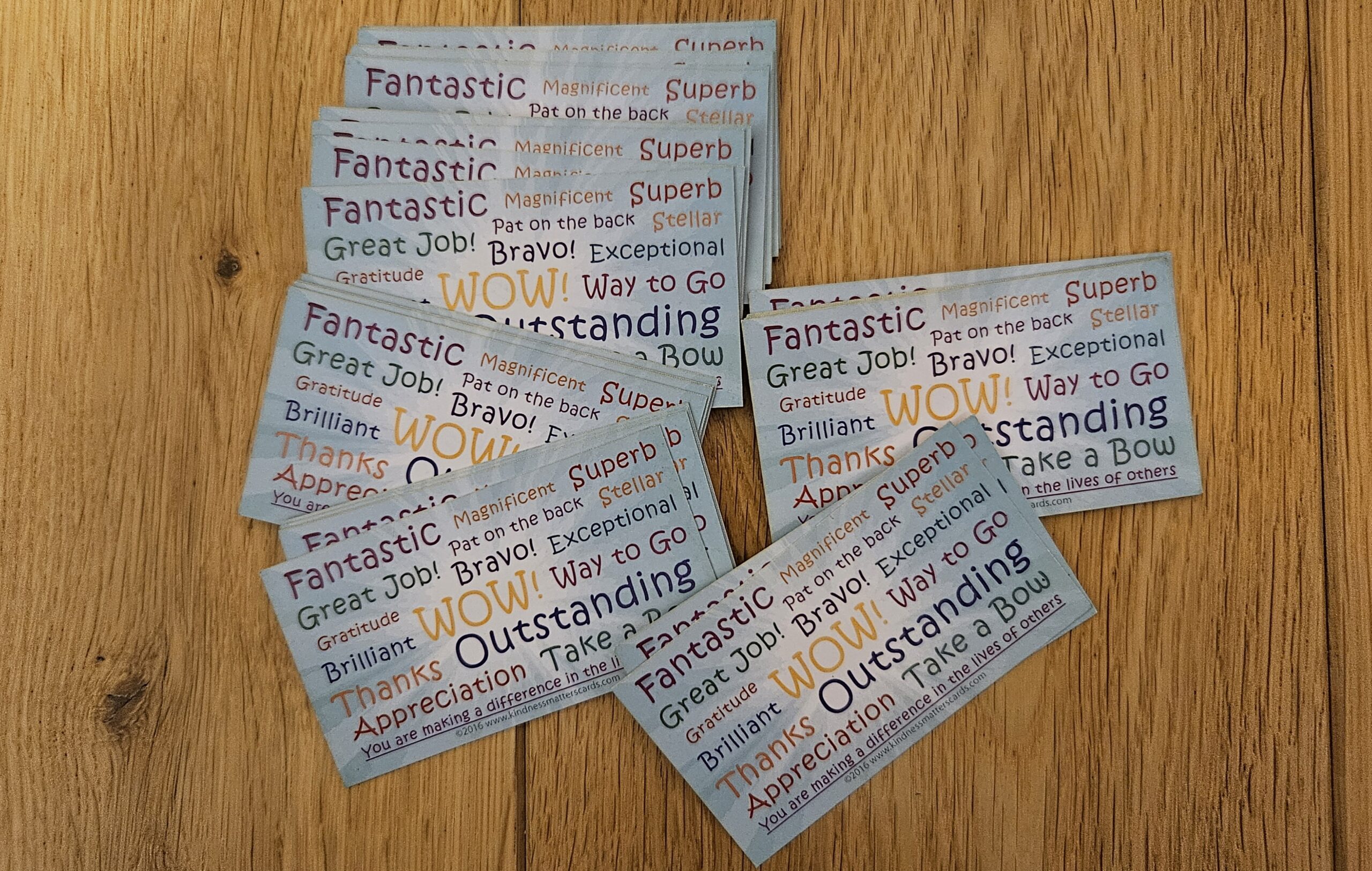 Talia bilecików do wręczenia dla ucznia. Bilecików jest 50, są dwustronne, na jednej stronie napis You are awesome, na odwrocie, chmura wyrazowa – różne wzmacniające zawołania.